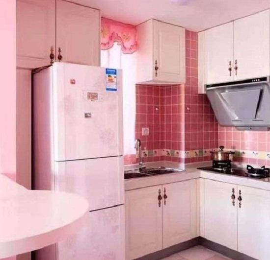 Khu bếp nhỏ nhắn với đồ làm bếp từ cơ bản đến các vật dụng nhỏ nhất như chiếc thùng rác cũng được lựa chọn màu hồng theo ý thích của cô chủ và được sắp xếp rất gọn gàng, kế bên là bộ bàn ăn hồng phấn xinh xắn đủ chỗ cho hai vợ chồng.