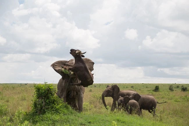 Voi khổng lồ tung độc chiêu khiến trâu rừng tử vong phút mốt