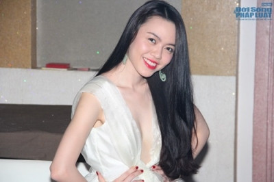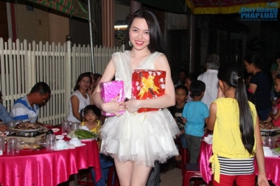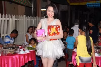 Diện trang phục lộng lẫy đứng giữa bữa tiệc hàng trăm người tại quê Đồng Nai, "nữ hoàng sắc đẹp quốc tế 2009" khiến nhiều người nghĩ rằng cô đã bí mật kết hôn.