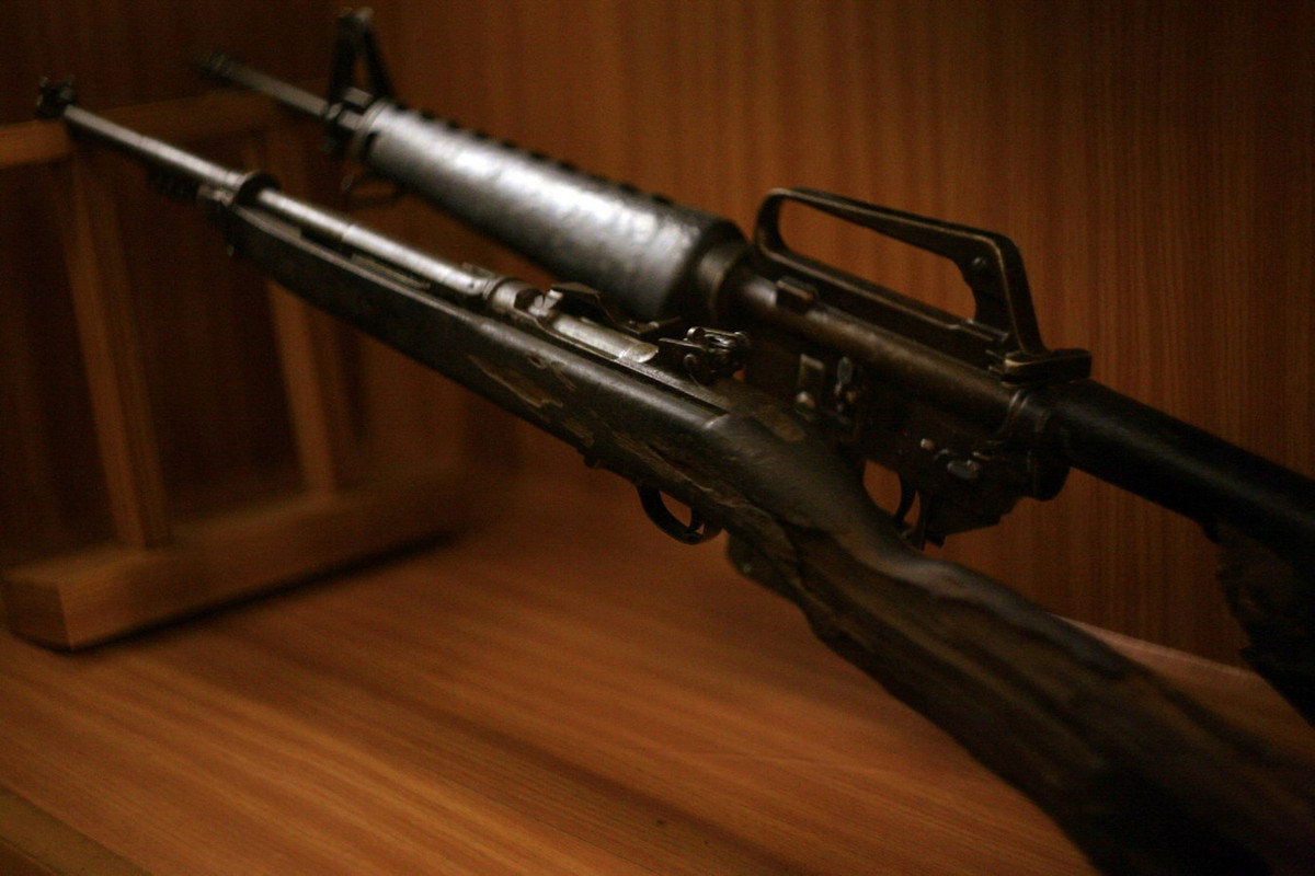 Súng tiểu liên AR15 của Anh hùng Lực lượng Vũ trang Nhân dân Lê Thị Hồng Gấm và súng trường carbin của Anh hùng Lực lượng Vũ trang Nhân dân Nguyễn Thị Út (chị Út Tịch) sử dụng trong kháng chiến chống Mỹ. Ảnh: Quốc Lê.