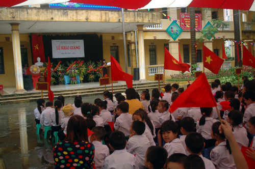 | Trường tiểu học Xuân Phương, Từ Liêm, Hà Nội che bạt khai giảng năm học mới. |