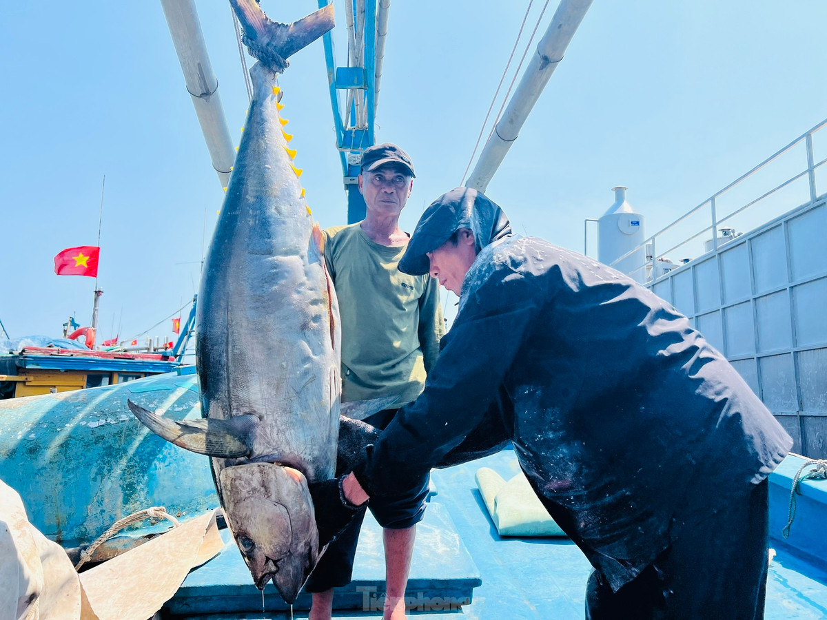“Sau 18 ngày lênh đênh trên ngư trường Hoàng Sa, tàu của tôi câu được 57 con cá ngừ đại dương, sau khi trừ hết chi phí cũng chia được cho anh em bạn thuyền mỗi người 15 triệu, nên ai nấy cũng vui mừng”, ngư dân Minh chia sẻ. Ảnh: Nguyễn Ngọc