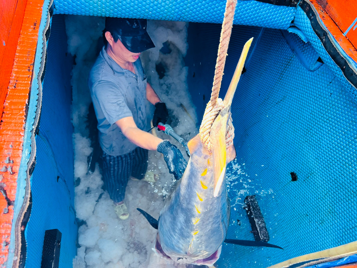 Theo anh Chiến, trung bình mỗi con từ 30-40kg, với giá bán 92-100 nghìn đồng/kg, tàu anh chỉ thu về khoảng 50 triệu, trong khi đó phí tổn đã 100 triệu, chuyến này lỗ 50 triệu. Ảnh: Nguyễn Ngọc