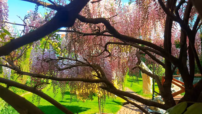 Vườn hoa nổi bật với giàn hoa tử đằng tím hồng đẹp lung linh phủ kín trước hiên nhà. Loài hoa này chị trông cách đây 6 năm và năm nay, cây trổ bông nhiều, dày đặc.