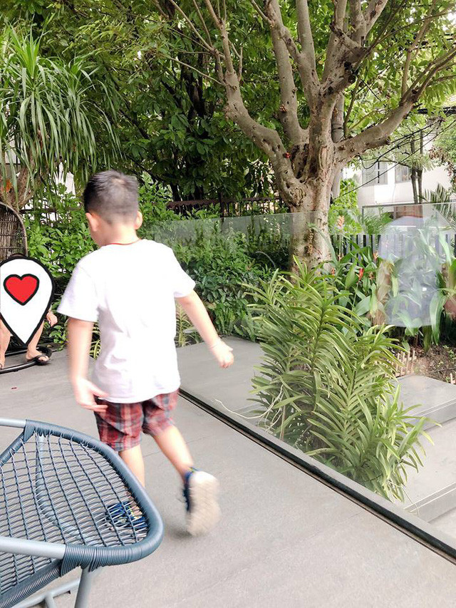 Điều đó cũng tạo ra sân chơi mát mẻ cho con trai cô. Từ lối đi lên vườn Bảo Ngọc không chỉ trồng hoa mà còn trồng cả cây to tạo bóng mát.
