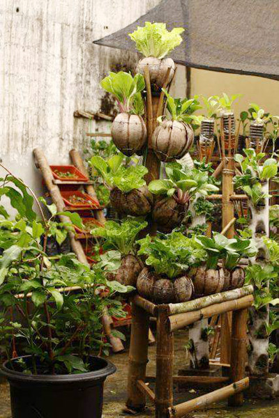 Trái dừa già, sau khi được bóc lấy gáo đi, phần vỏ nguyên được tận dụng làm chậu trồng cây. Với chất liệu từ dừa, kích thích cây ra rễ nhanh, giữ ẩm tốt… phù hợp trồng cây cảnh, hoa kiểng các loại. Móc treo bằng kẽm gồm 03 sợi dây kẽm móc vào thành vỏ trái dừa, chia chu vi miệng trái dừa thành 03 phần bằng nhau, tạo sự cân bằng để khi treo chậu lên không bị nghiêng hoặc đỗ, ngã. Ngoài móc treo bằng kẽm còn có thể sử dụng móc treo bằng nhựa dẻo hay các loại dây móc khác.