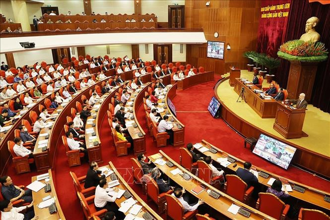 Tổng Bí thư Nguyễn Phú Trọng cùng Chủ tịch nước Nguyễn Xuân Phúc, Thủ tướng Chính phủ Phạm Minh Chính, Chủ tịch Quốc hội Vương Đình Huệ chủ trì hội nghị. Trong ảnh: Tổng Bí thư Nguyễn Phú Trọng, Chủ tịch nước Nguyễn Xuân Phúc cùng các đồng chí lãnh đạo Đảng, Nhà nước dự hội nghị.