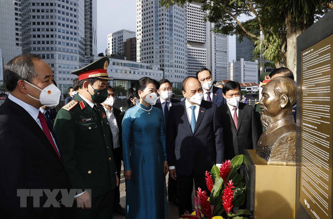 Chủ tịch nước Nguyễn Xuân Phúc và phu nhân cùng đoàn cấp cao Việt Nam đến dâng hoa tại Tượng đài Chủ tịch Hồ Chí Minh ở Singapore. Ảnh: TTXVN