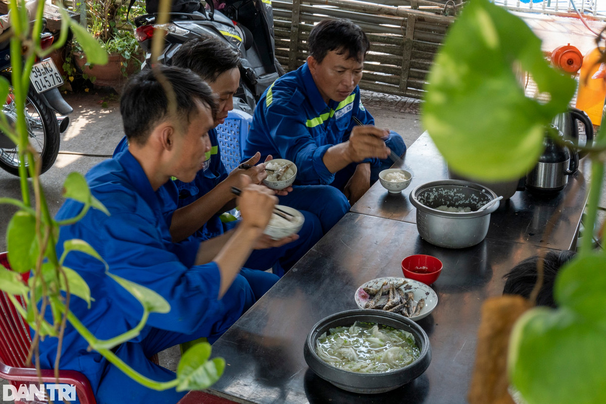 11h30 trưa, kết thúc ca làm buổi sáng, anh em công nhân quay lại căn chòi được dựng tạm để nghỉ ngơi, ăn trưa. Bữa ăn có canh và cá chiên được chuẩn bị nhanh trong vài phút cho 6 người.