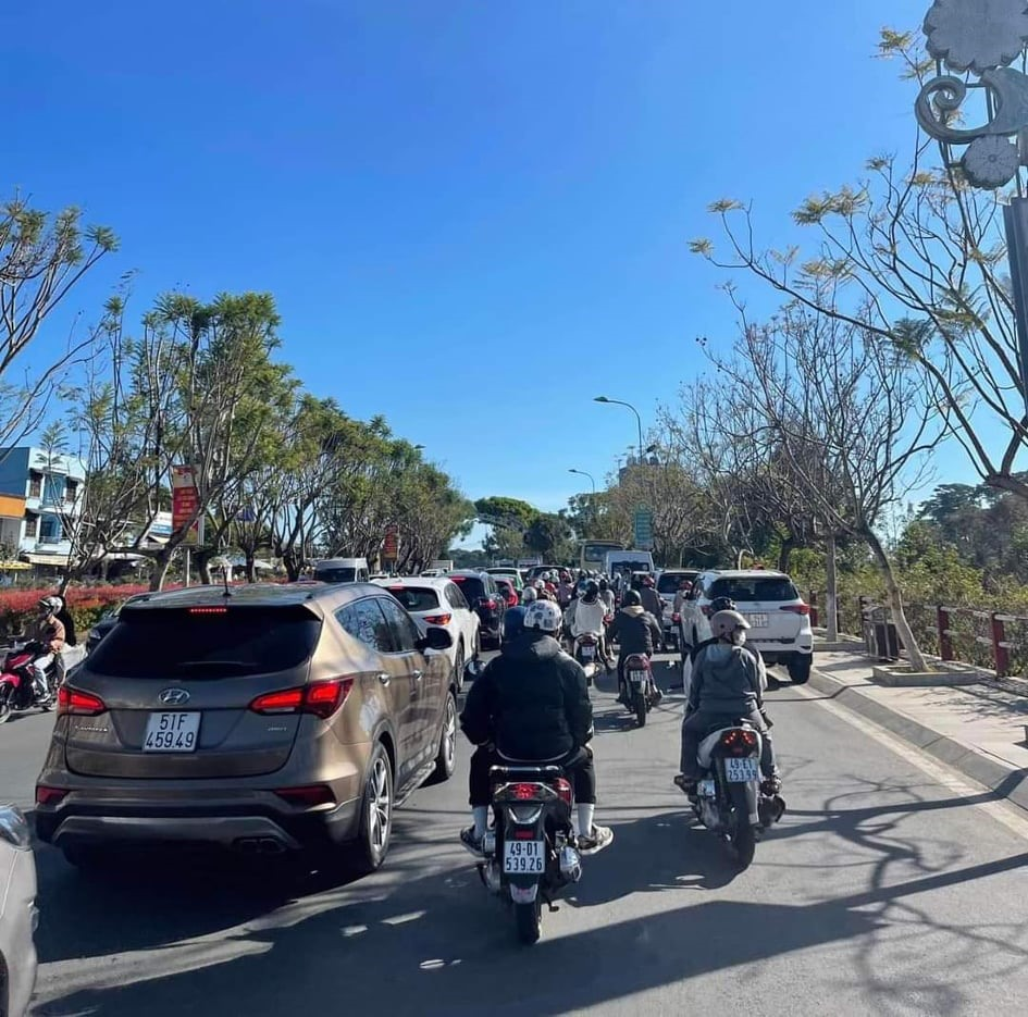 Mùng 4 Tết, nhiều tuyến đường chính trong nội thành Đà Lạt rơi vào cảnh quá tải, đường xá đông đúc. Ảnh Son Ha Luu