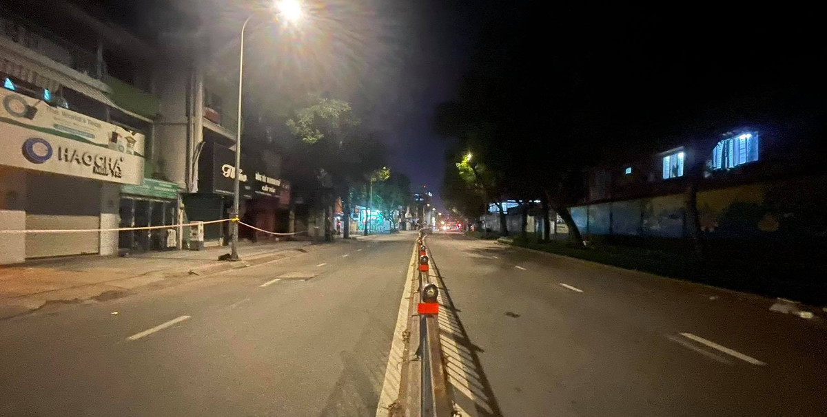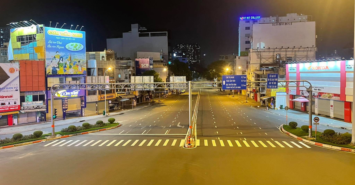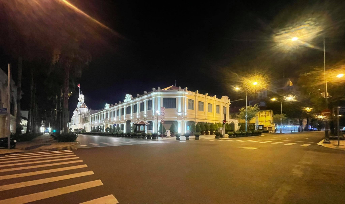Khắp đường phố Sài Gòn không bóng người và phương tiện trong tối đầu tiên TP.HCM thực hiện phong tỏa nghiêm ngặt; dừng tất cả các hoạt động từ 6h tối hôm trước đến 6h sáng hôm sau.