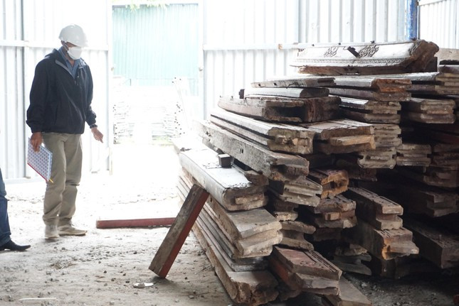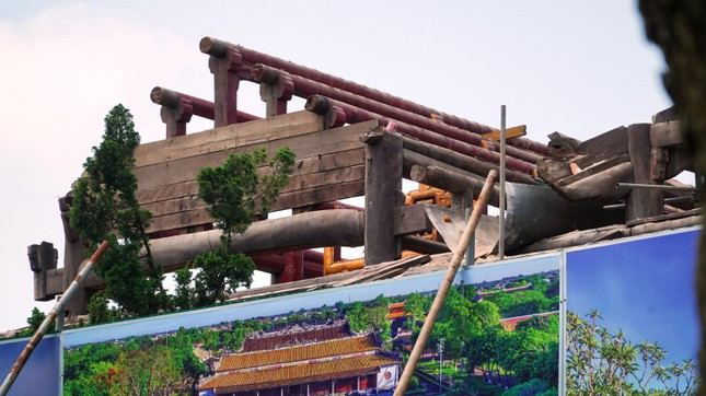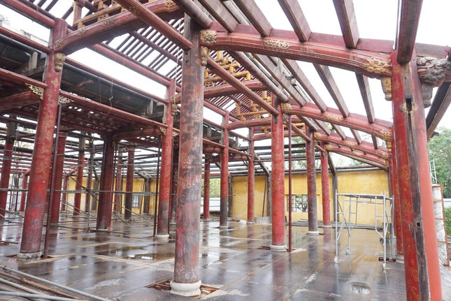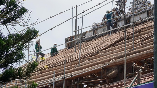 Hiện nay, đơn vị thi công đang tiến hành hạ giải phần mái ngói, tháo dỡ từng ô pháp lam trang trí trên bờ nóc, cổ diềm công trình; hạ giải các ô hộc bờ nóc, bờ quyết, cổ diềm, đầu hồi, các con giống trang trí xuống khỏi công trình; tháo dỡ hệ vách ván, liên ba, ngưỡng cửa. Sau khi lắp dựng nhà bao che mới tiến hành hạ giải kết cấu mái gỗ gồm cột kèo, xuyên, trến, đòn tay…