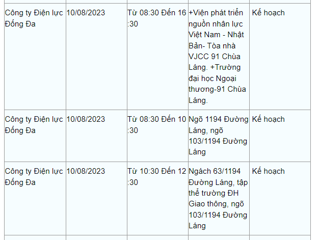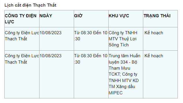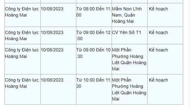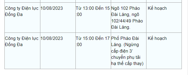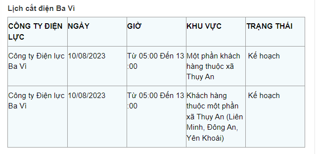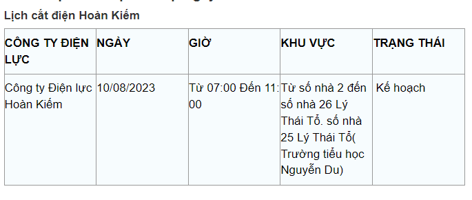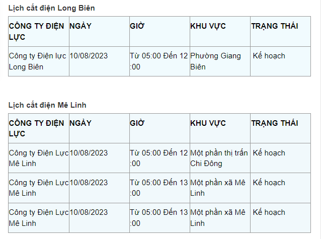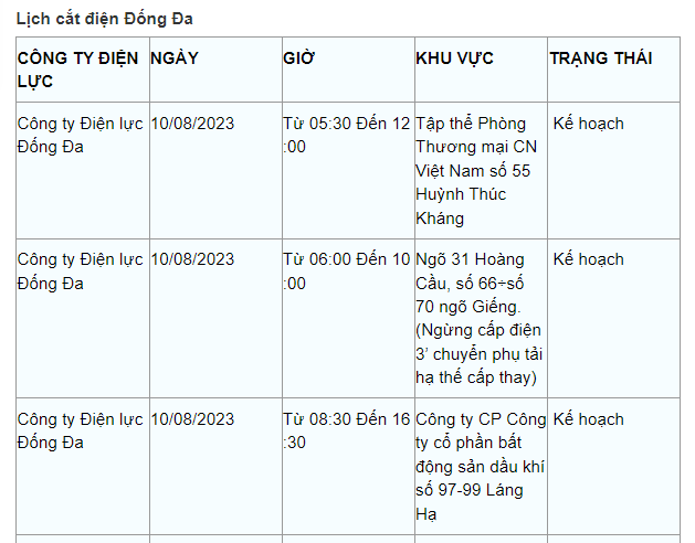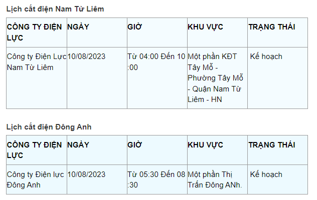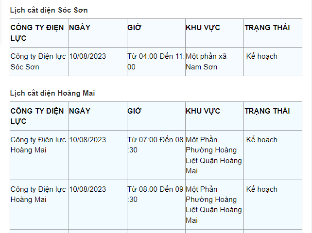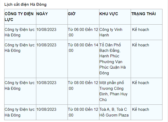 Lịch cắt điện Hà Nội hôm nay mới nhất theo từng khu vực được cập nhật từ cổng thông tin Tổng Công ty Điện lực Hà Nội ngày 10/8/2023.