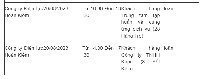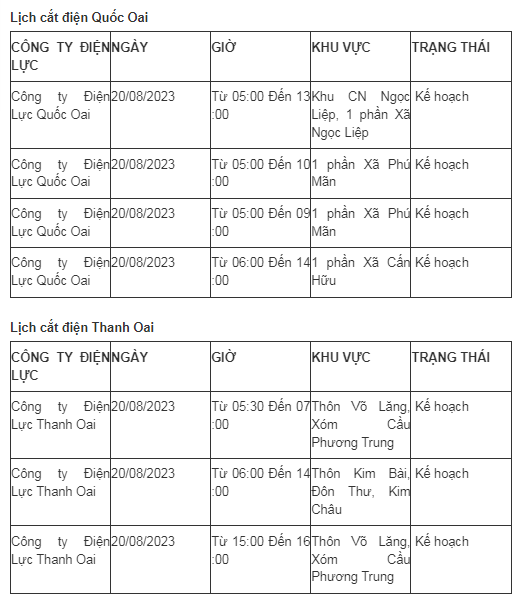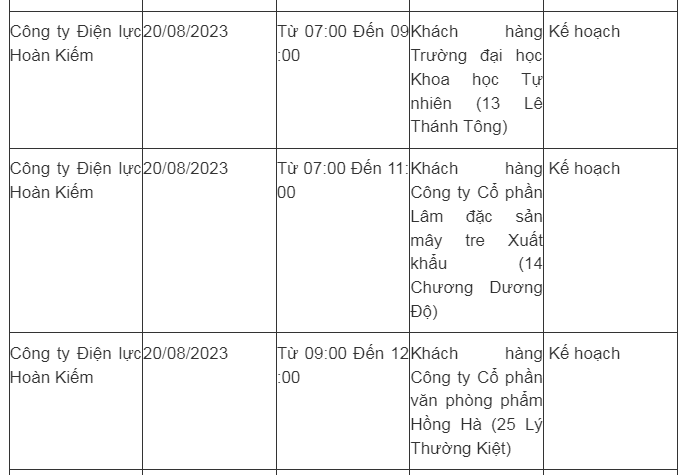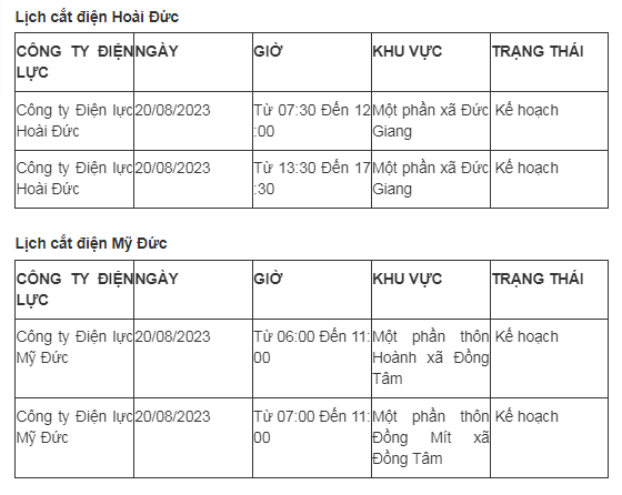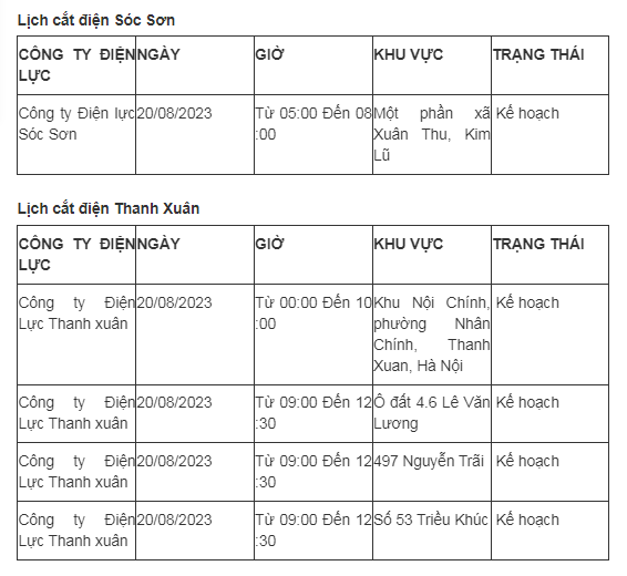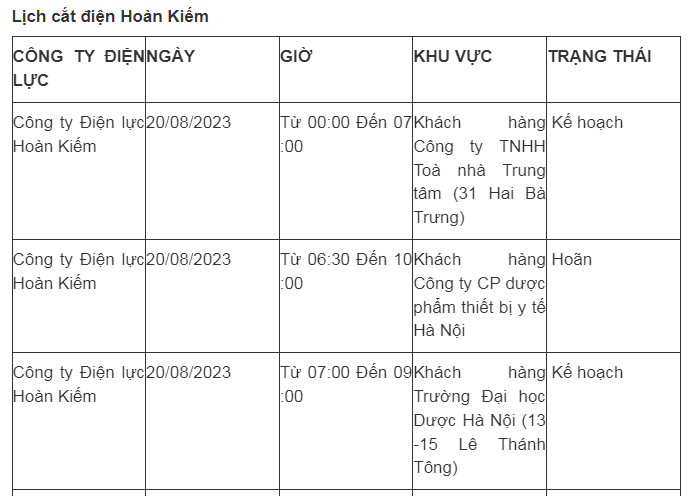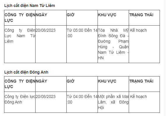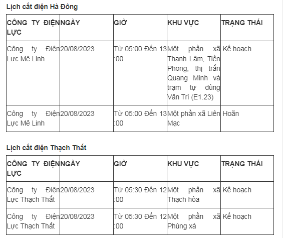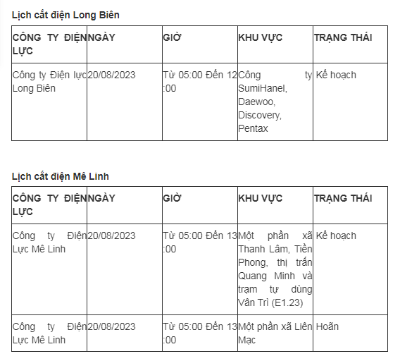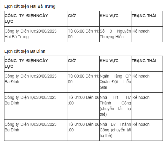 Lịch cắt điện Hà Nội hôm nay mới nhất theo từng khu vực được cập nhật từ cổng thông tin Tổng Công ty Điện lực Hà Nội ngày 20/8/2023.