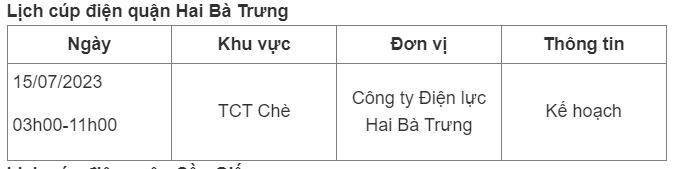 Lịch cúp điện Hà Nội ngày 15/7/2023