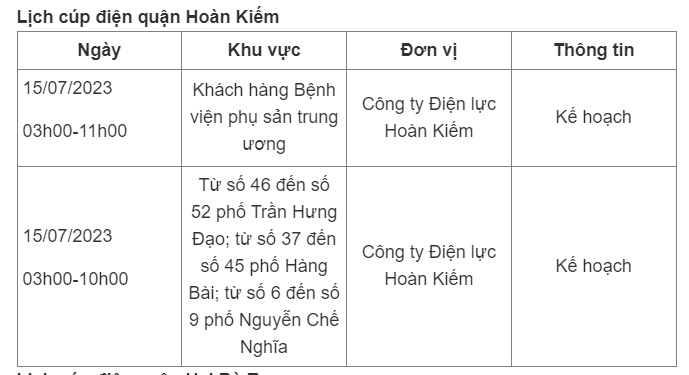 Lịch cúp điện Hà Nội hôm nay mới nhất theo từng khu vực được cập nhật từ cổng thông tin Tổng Công ty Điện lực Hà Nội ngày 15/7/2023.
