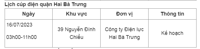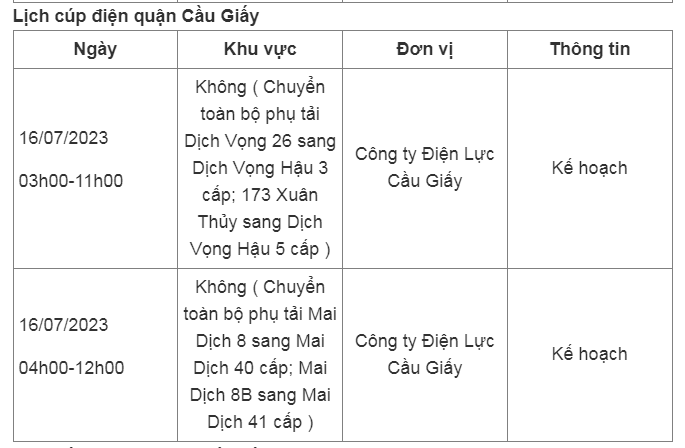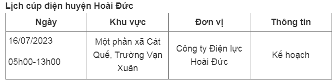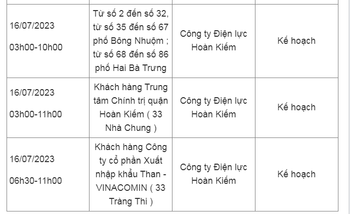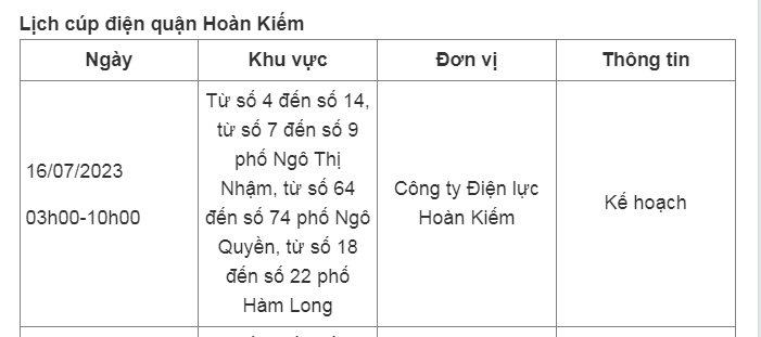 Lịch cúp điện Hà Nội hôm nay mới nhất theo từng khu vực được cập nhật từ cổng thông tin Tổng Công ty Điện lực Hà Nội ngày 16/7/2023.
