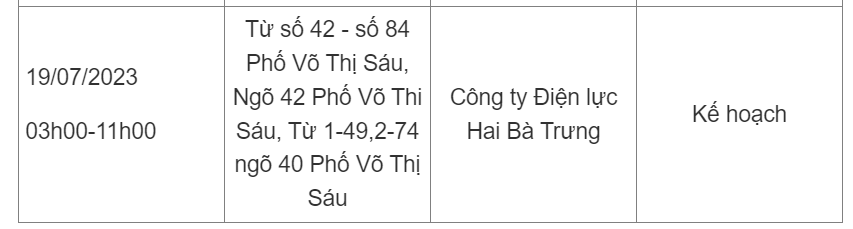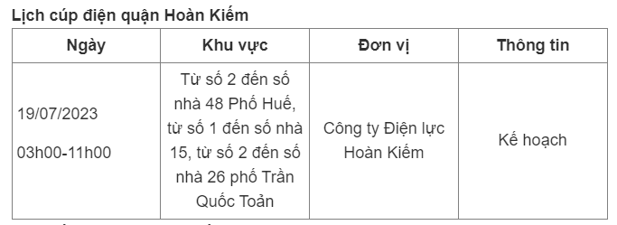 Lịch cúp điện Hà Nội hôm nay mới nhất theo từng khu vực được cập nhật từ cổng thông tin Tổng Công ty Điện lực Hà Nội ngày 19/7/2023.