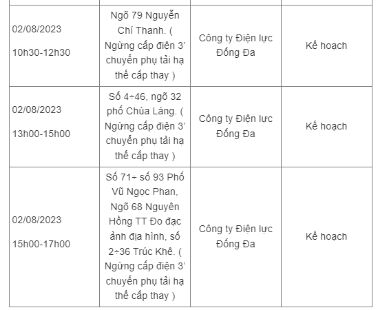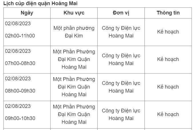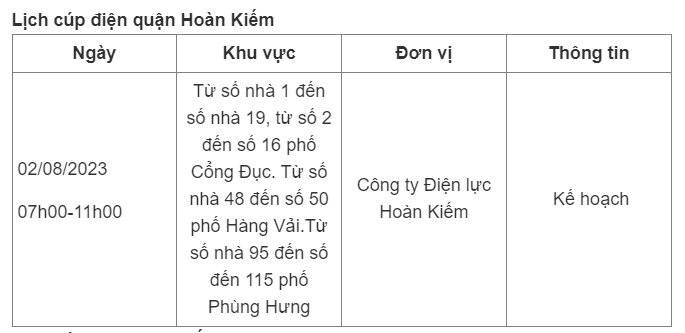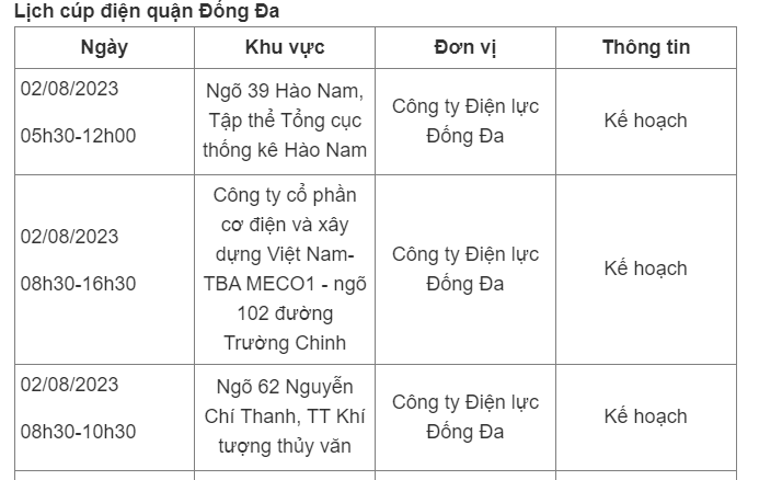 Lịch cúp điện Hà Nội hôm nay mới nhất theo từng khu vực được cập nhật từ cổng thông tin Tổng Công ty Điện lực Hà Nội ngày 2/8/2023.