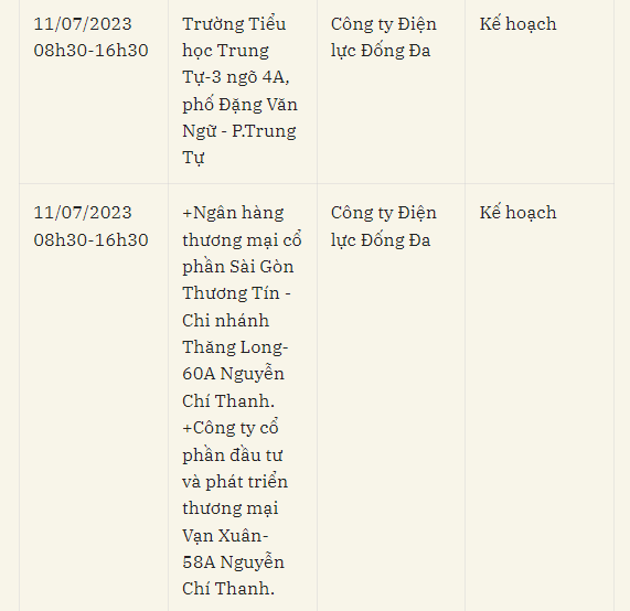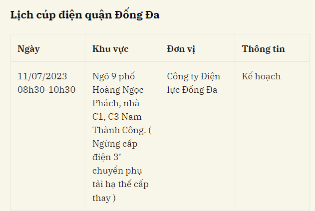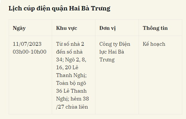 Lịch cúp điện Hà Nội hôm nay mới nhất theo từng khu vực được cập nhật từ cổng thông tin Tổng Công ty Điện lực Hà Nội ngày 11/7/2023.