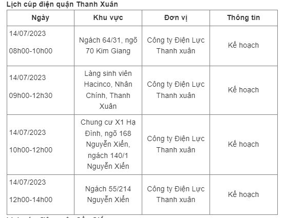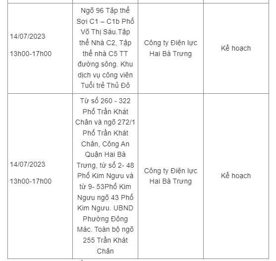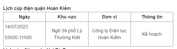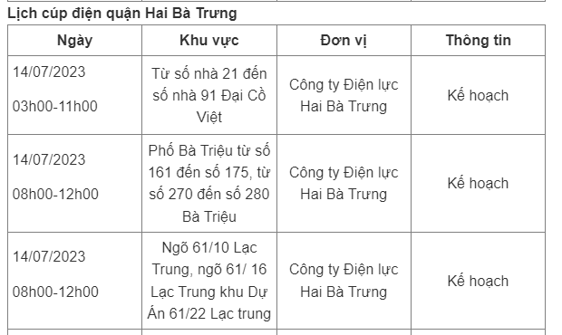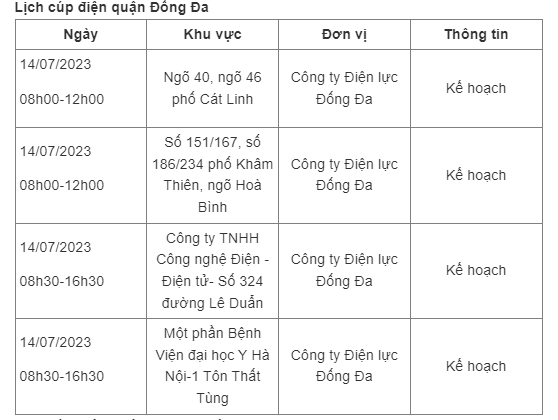 Dưới đây là chi tiết lịch cúp điện Hà Nội ngày 14/7/2023.