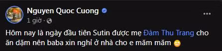 Trên trang cá nhân, Cường Đô La hào hứng chia sẻ khoảnh khắc xin nghỉ làm "chủ tịch" một hôm để vào vai bố bỉm cho con ăn dặm ngày đầu tiên.