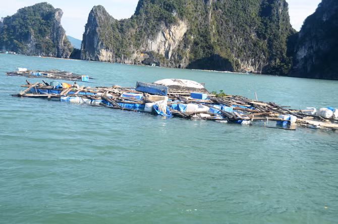 Xác lồng bè nuôi tu hài, hàu, cá song của hàng trăm hộ dân bị đánh nát trôi nổi khắp nơi.