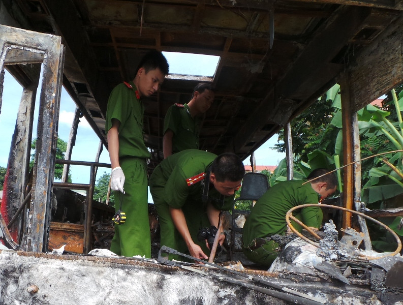 | Chiếc xe khách sau 1 đêm chỉ còn một bộ khung. |