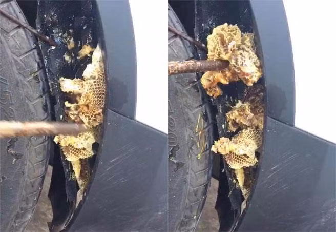 Khi kiểm tra đến phần chắn bùn ở bánh xe phía sau, anh Chu kinh ngạc khi phát hiện, có một tổ ong mật trong bộ phận chắn bùn xe.