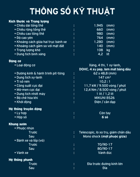 | Chiếc xe sở hữu động cơ 4 thì trục cam đôi DOHC có dung tích 147 phân khối. Tuy thuộc dòng xe phân khối lớn nhưng Suzuki Raider R150 rất gọn nhẹ với trọng lượng khô chỉ có 108 kg, giảm xóc sau monoshock, 2 phanh đĩa và hộp số gồm 6 cấp. |