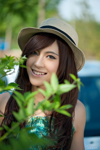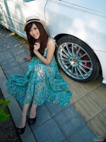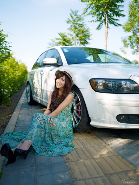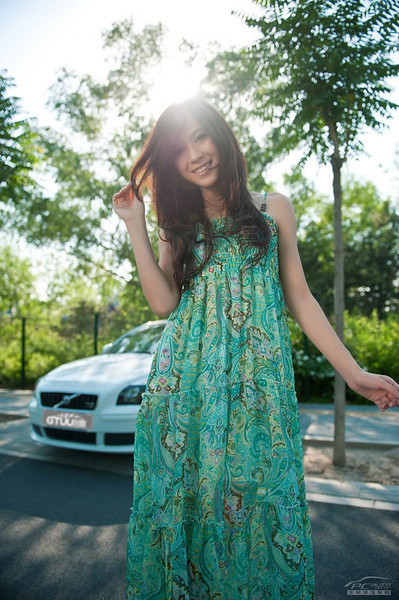 (Kiến Thức) -Thiếu nữ trẻ trung và duyên dáng trong trang phục váy xanh mùa hè rất đồng điệu với vẻ sang trọng và thanh lịch của chiếc Volvo trắng.