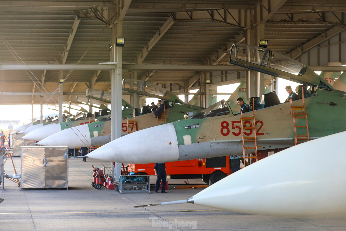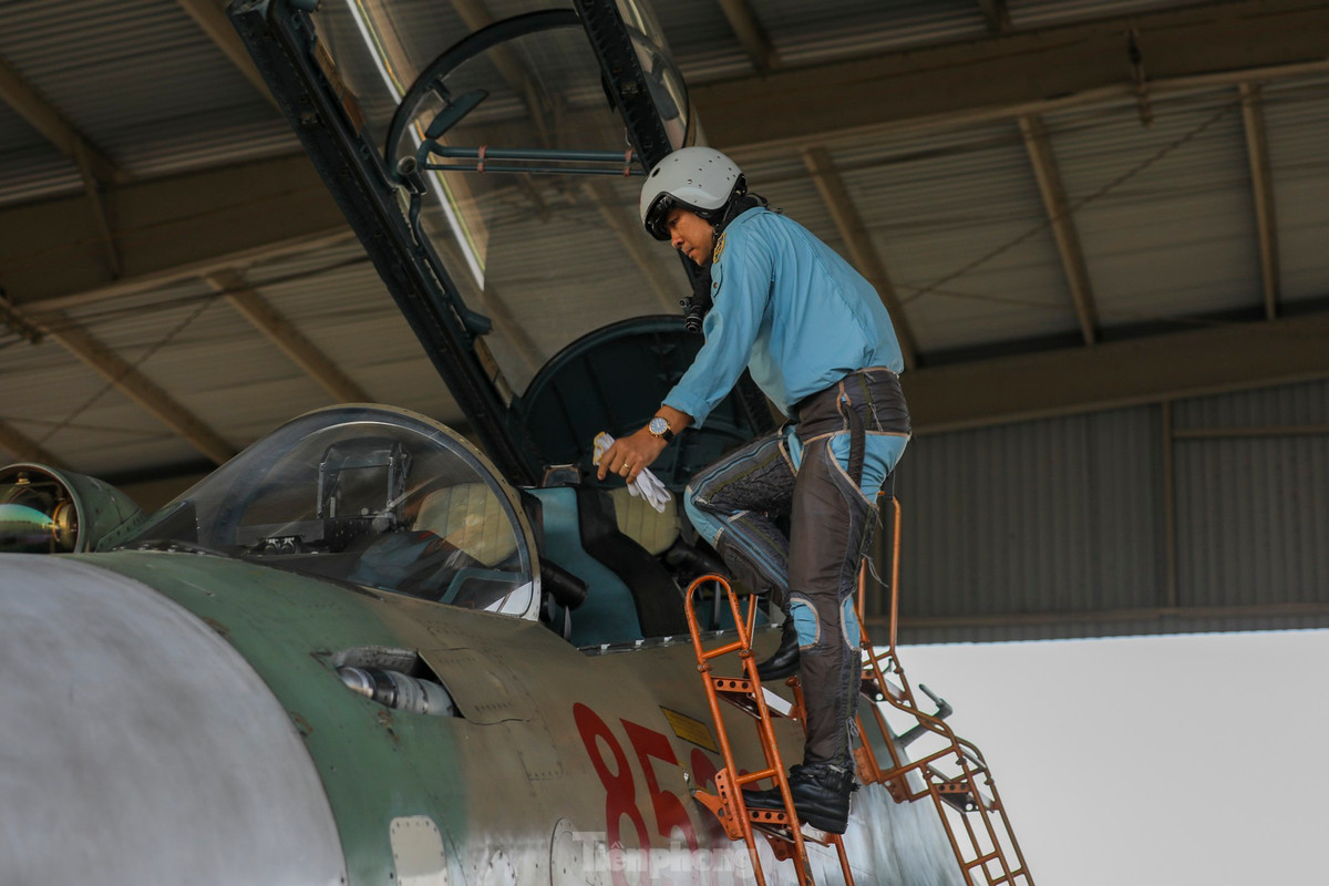 Từ 3h sáng, các nhân viên kỹ thuật bắt đầu công tác kiểm tra hệ thống điện và tra dầu cho thiết bị bay. Trước chuyến bay lúc 7h30, tổ kỹ thuật phụ trách từng tiêm kích Su-30MK2 cẩn thận kiểm tra buồng lái, tránh sai sót dù là nhỏ nhất.