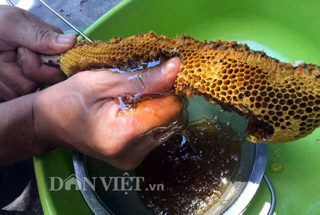Mật ong rú đang được vắt ra từ phần cuống trên của tổ.