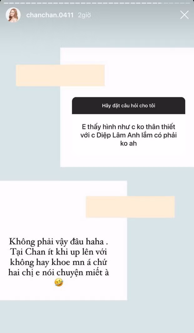 Cụ thể, trong phần hỏi - đáp với fans, một cư dân mạng thắc mắc: "Hình như em thấy chị và chị Diệp Lâm Anh không thân nhau lắm có phải không ạ?". Ngay sau đó, Xoài Non đã lên tiếng phủ nhận. Cô nàng cho biết: "Không phải vậy đâu, tại Trang ít đăng hình và không hay khoe chứ hai chị em vẫn nói chuyện miết à".