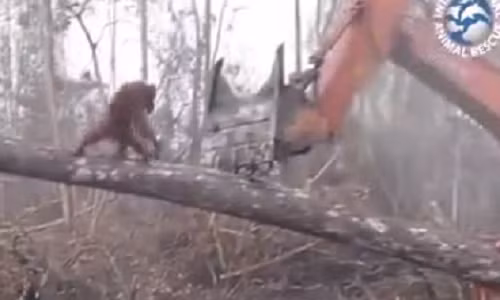 Một đoạn video mới đây được đưa lên mạng cho thấy cảnh một con đười ươi dường như đang cố gắng “bảo vệ” rừng cây của mình trong khi những chiếc máy đang tàn phá nơi nó ở.
