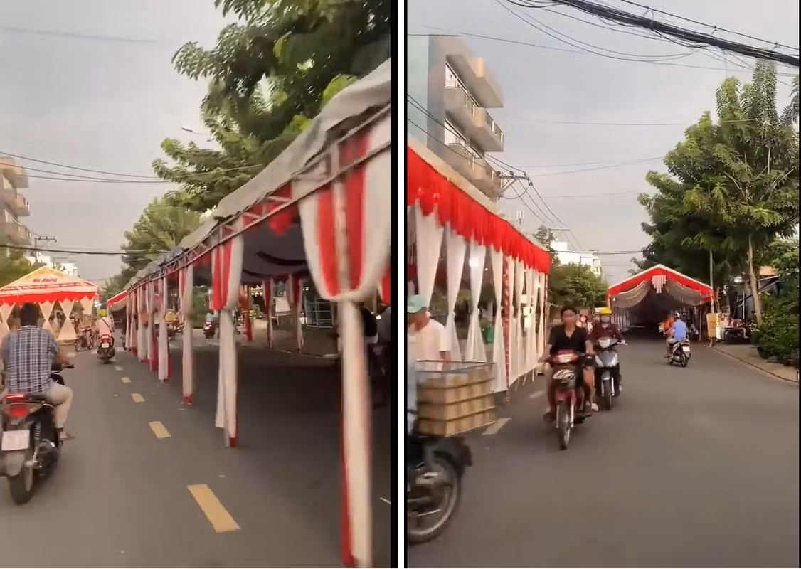 Theo clip, trên một tuyến đường đang có nhiều phương tiện cùng tham gia giao thông. Ngay từ đầu phố, một chiếc rạp cưới chắn ngang đường dựng lên bên tay phải, đi khoảng chục mét lại một rạp khác dựng lên bên tay trái, và rồi sau đó lại tiếp tục xuất hiện một rạp nữa bên tay phải của đường.