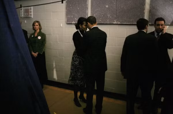 Bà Michelle chỉnh lại cà-vạt cho chồng.