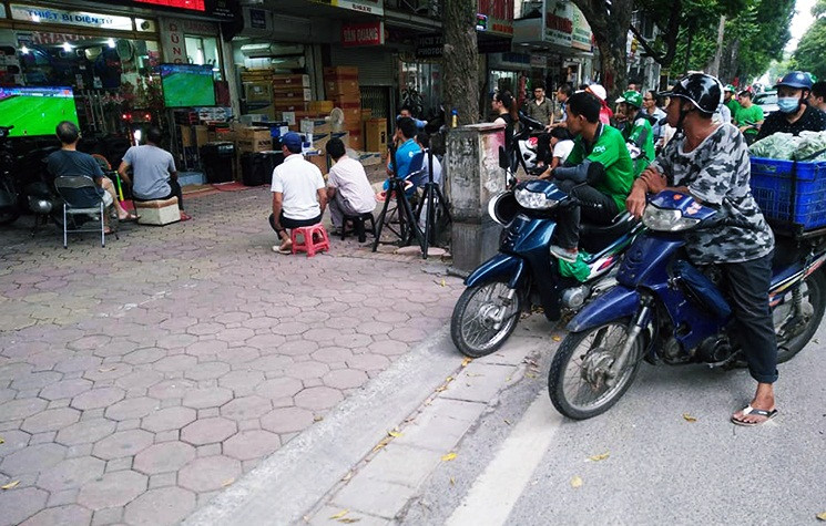 Một số cửa hàng điện tử trên phố Hai Bà Trưng cũng rất nhiệt tình bật các màn hình ti vi hướng ra phía bên ngoài đường để người hâm mộ theo dõi.