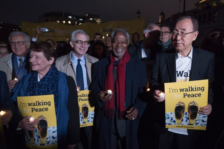 Các thành viên của nhóm The Elders, một nhóm được thành lập bởi cố Tổng thống Nam Phi Nelson Mandela, đã tham gia buổi lễ thắp nến tưởng niệm Mandela [Ảnh: Carl Court/Getty Images]