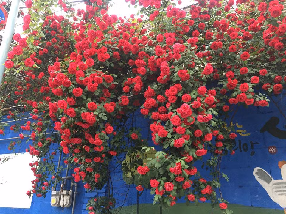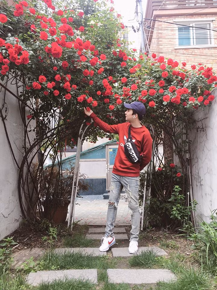 | Thành viên Sơn Nguyễn và cánh cổng hoa hồng rực rỡ. |